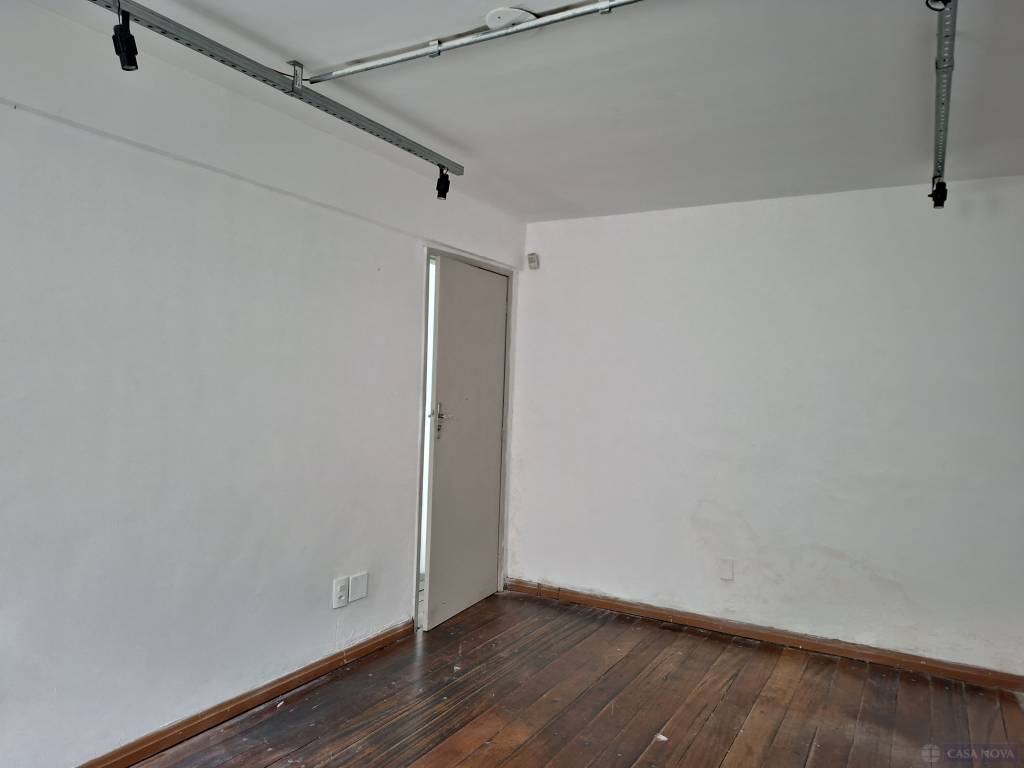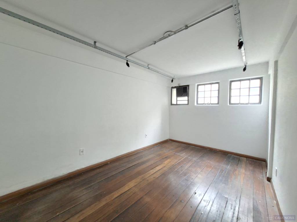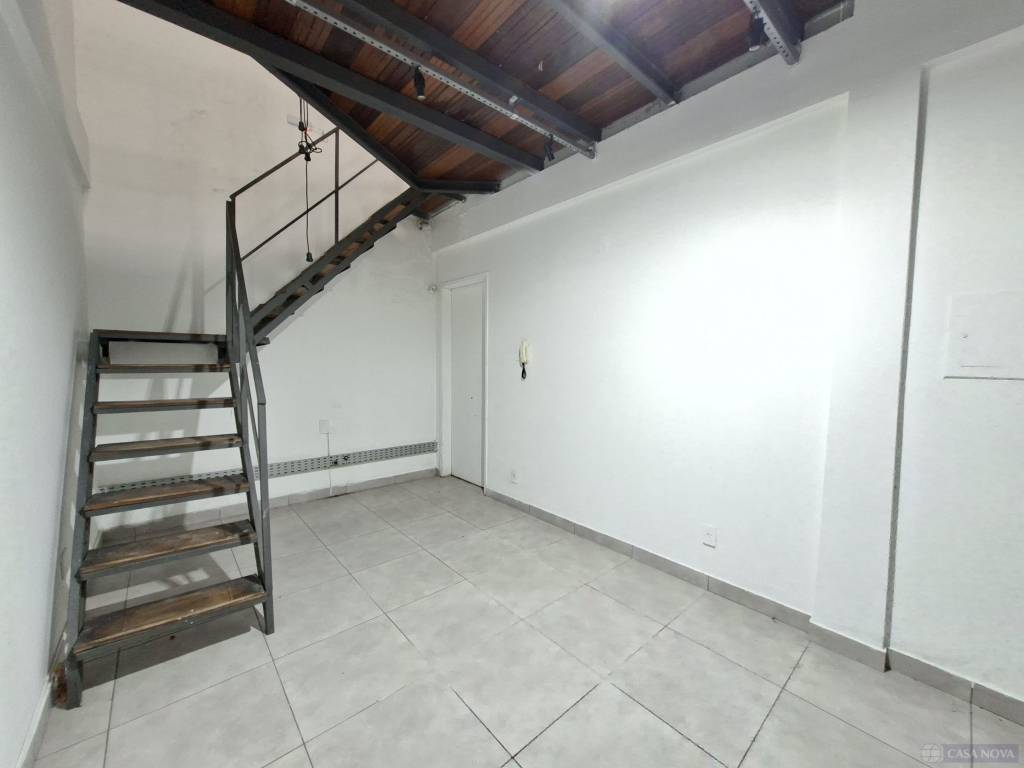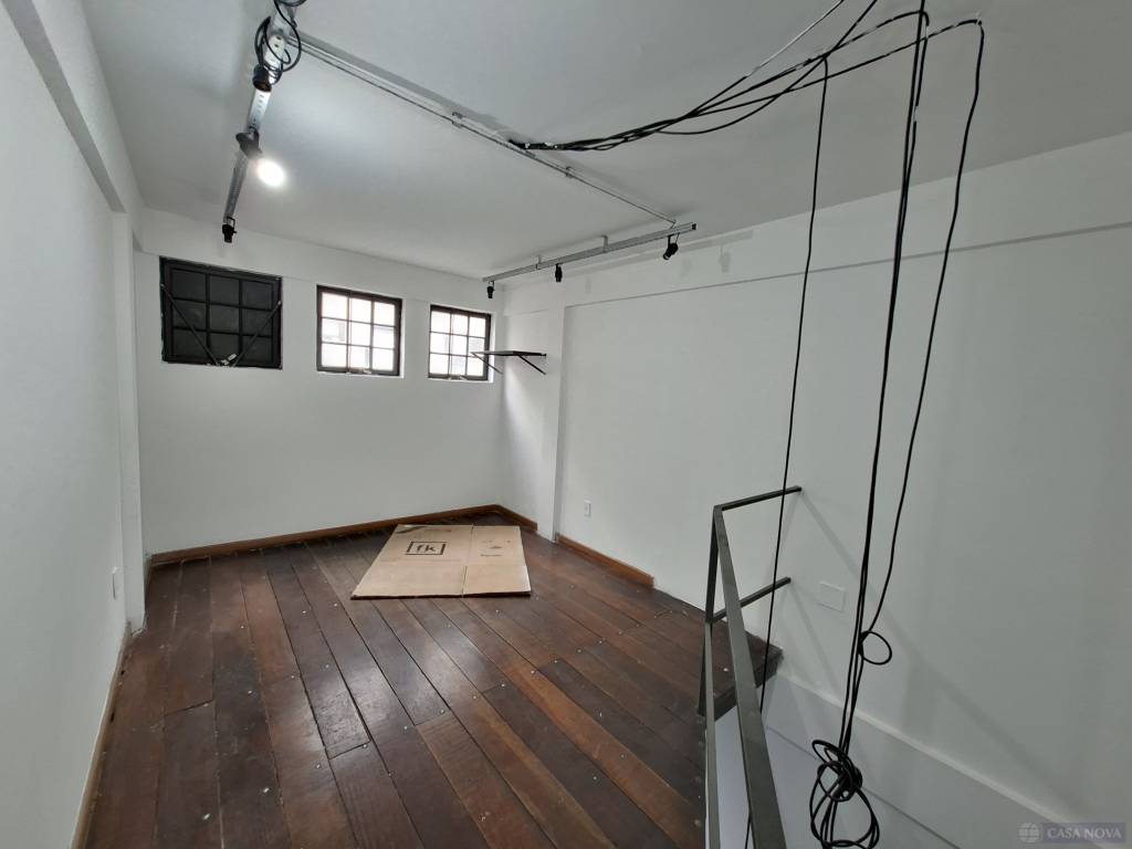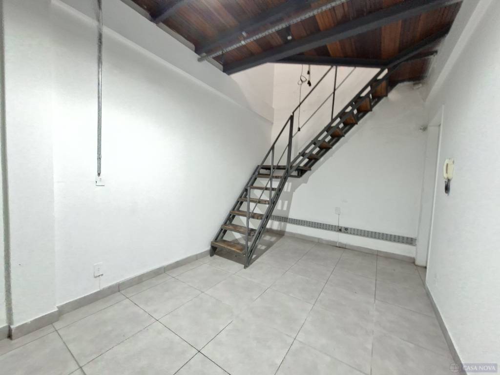 Uma sala comercial com cerca de 30 m², contendo uma sobreloja e dois banheiros comunitários.