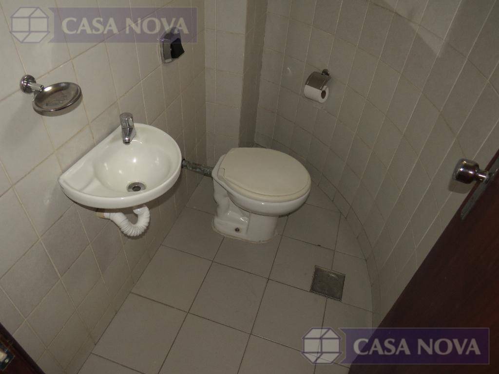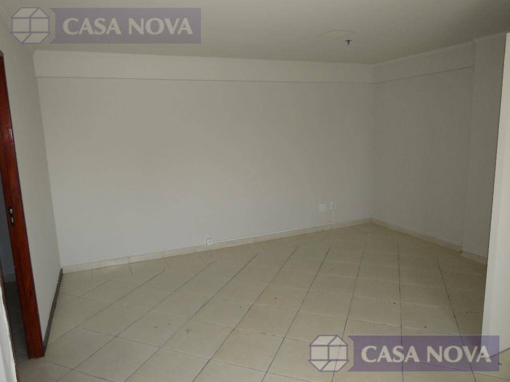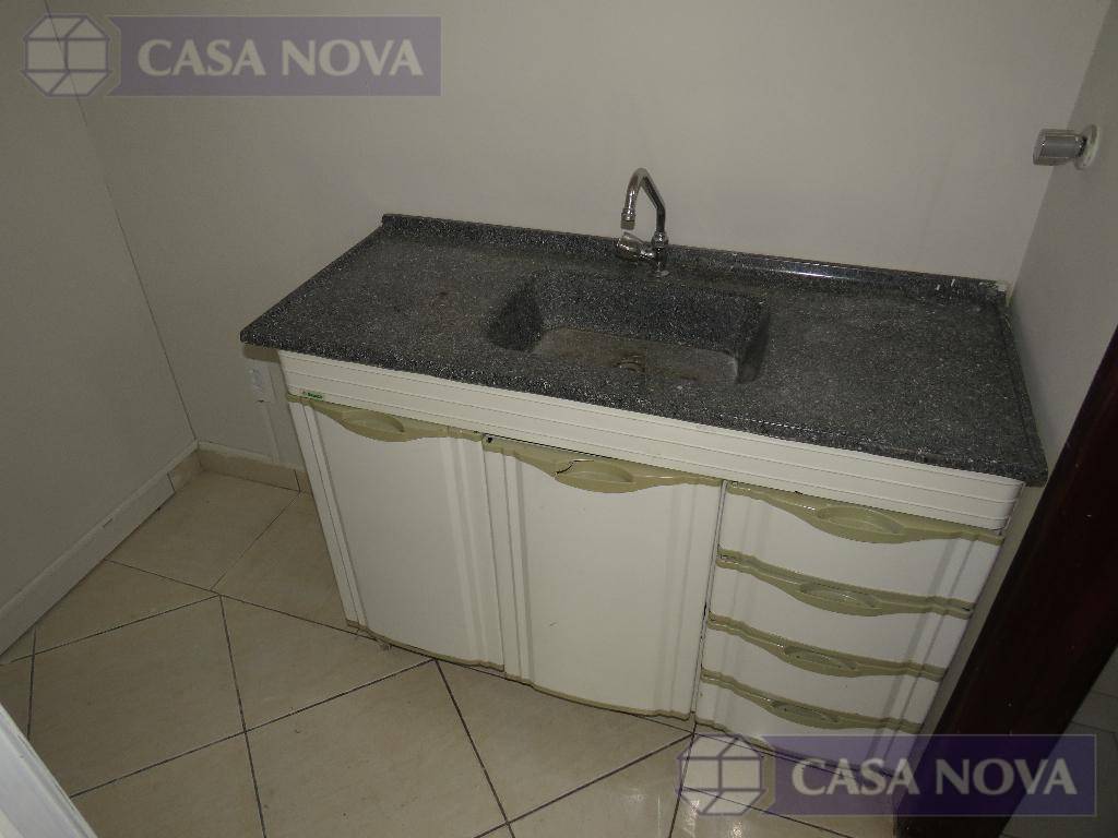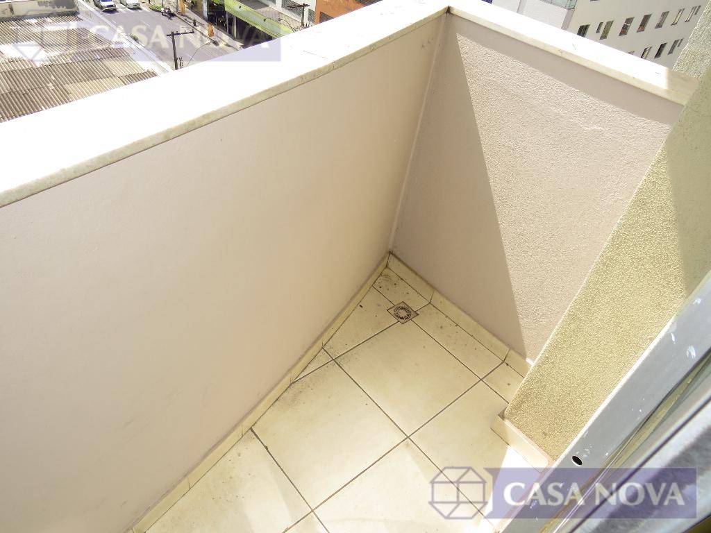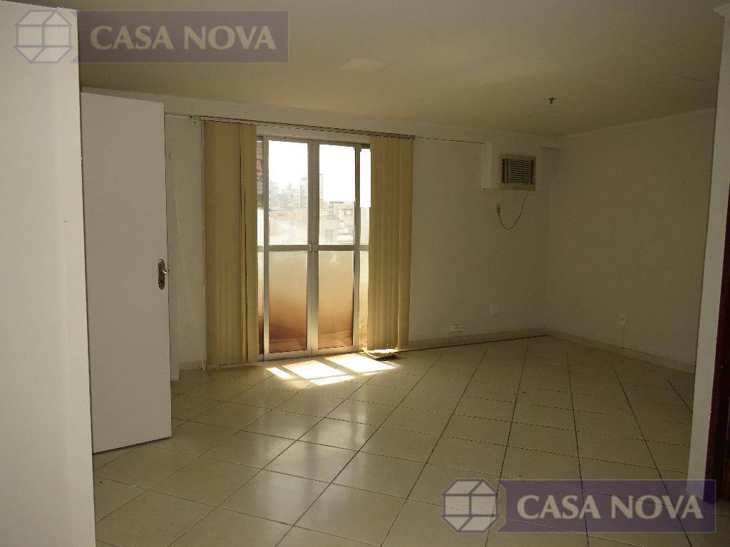 Uma sala comercial com cerca de 40 m² com sacada, escritório, cozinha e banheiro.